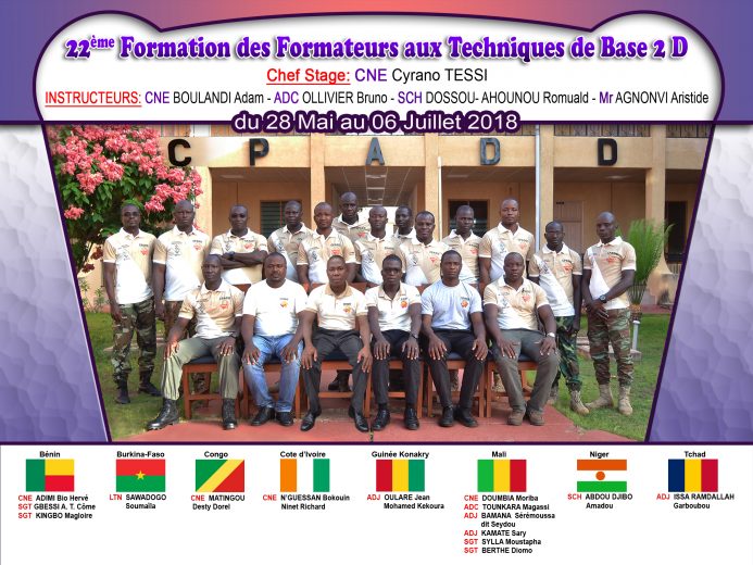 Le 22e stage formation des formateurs en déminage humanitaire a été effectué, sous financement principalement de l’UNMAS MALI (6), la Direction de la Coopération Sécurité défense du Ministère de l’Europe et des Affaires étrangères français(8) et 2 stagiaires auto-financés . Ce stage a débuté le 28 mai et a pris fin le 07 juillet 2018, et ce, au profit de 16 stagiaires.