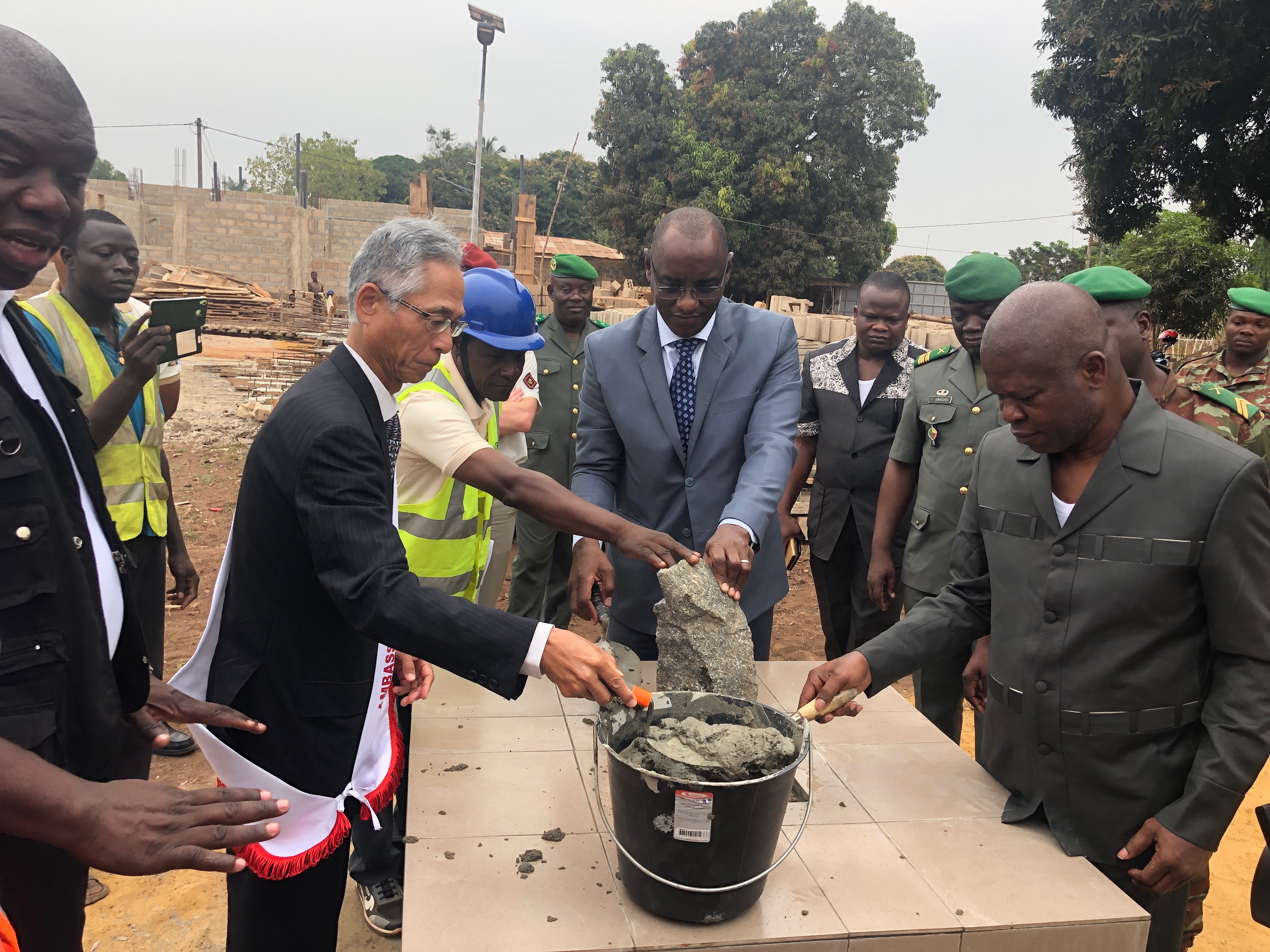 Pose de première pierre. De gauche à droite: SEM KIOFUMI KONG SI (ambassadeur du Japon au Bénin) , Adama Bocar SOKO (Représentant Résident du PNUD) , NOUATIN ALAIN FORTUNET ( Ministre de la Défense nationale).